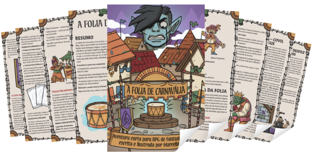 Agora, Marcella traz essa mesma magia em uma nova versão: o Kit Mestre RPG – Edição Carnaval, um material totalmente ilustrado e desenvolvido por ela, feito para transformar o carnaval dos jogadores em uma grande aventura.